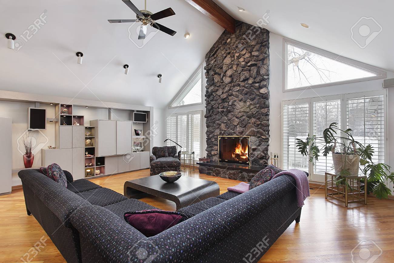 Habitación Familiar Con Chimenea De Piedra De Dos Pisos Y Vigas De Madera Fotos, retratos, imágenes y fotografía de archivo libres de derecho. Image 75241391