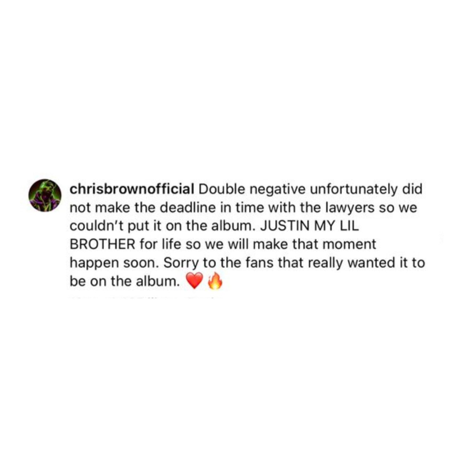 Justin Bieber Crew on X: "In a recent Instagram comment, Chris Brown said that Justin Bieber was supposed to be on his new album on a song named “Double Negative”, but he
