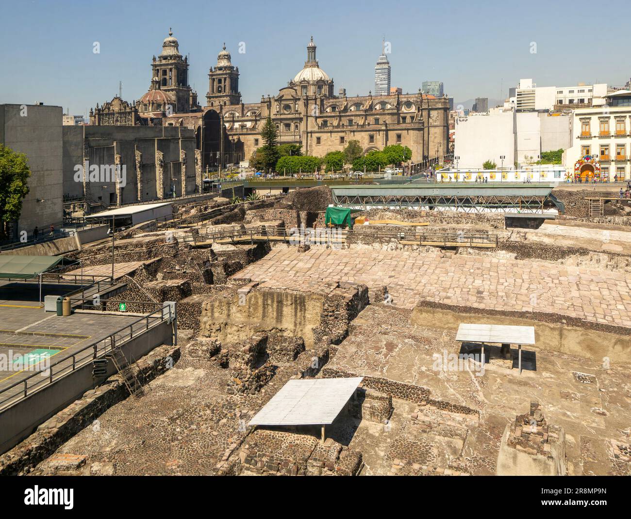 Templo Mayor arqueológica ciudad azteca de Tenochtitlan, vista a la iglesia catedral, Ciudad de México, México Fotografía de stock - Alamy