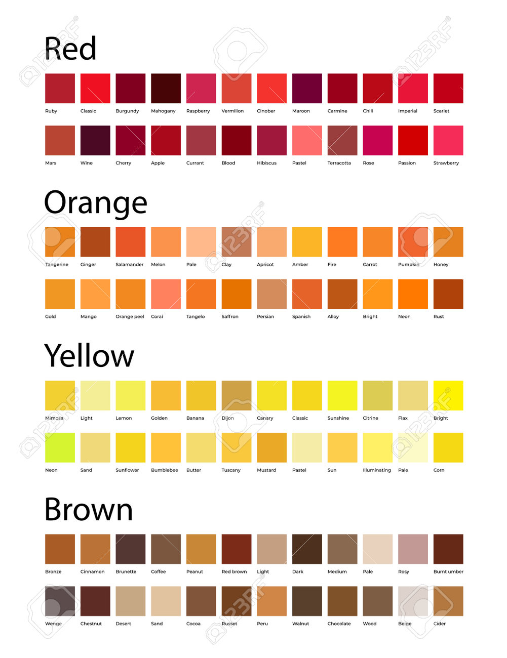 Red, Orange, Yellow And Brown Colors Shades Swatches Palette With Color Names Royalty Free SVG, Cliparts, Vectors, and Stock Illustration. Image 192032643.