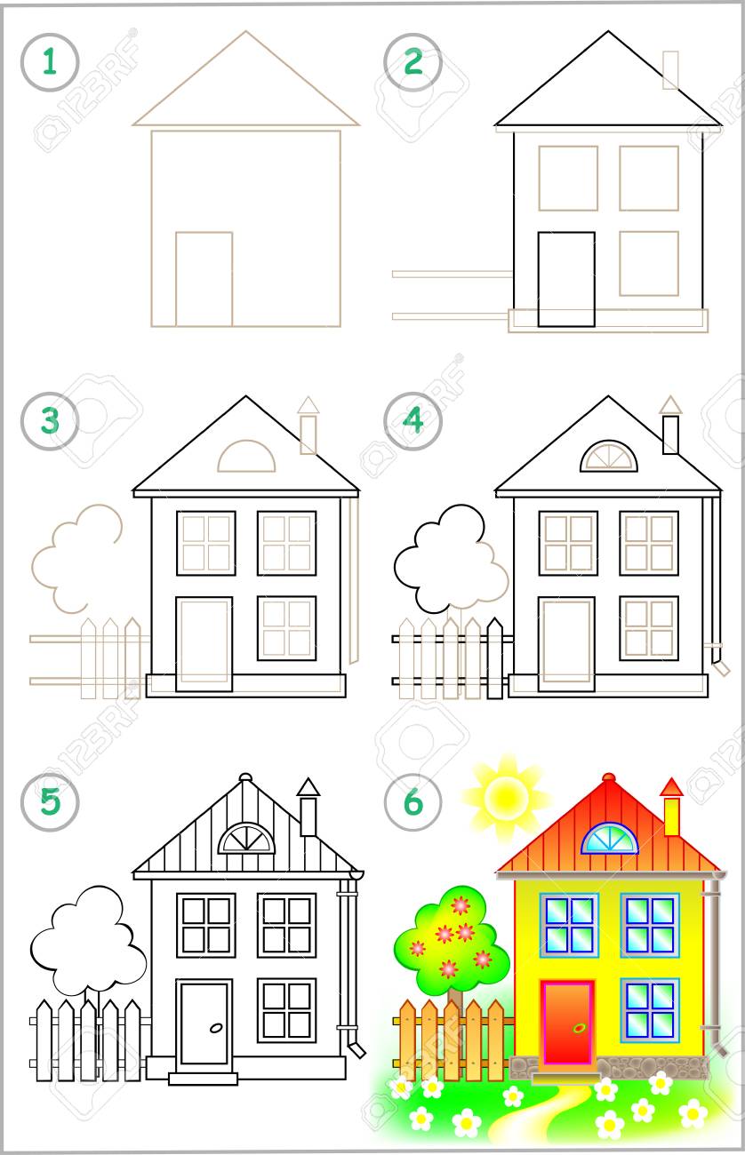La Página Muestra Cómo Aprender Paso A Paso A Dibujar Una Casa. Desarrollar Habilidades Infantiles Para Dibujar Y Colorear. Imagen Vectorial Ilustraciones svg, vectoriales, clip art vectorizado libre de derechos. Image 92953094