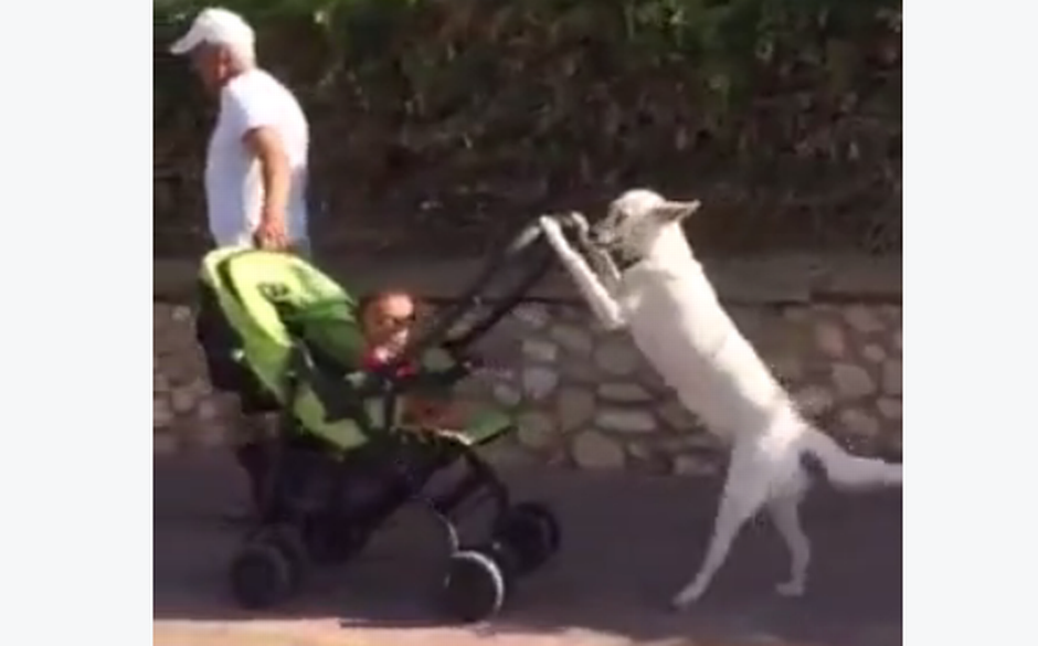 El increíble vídeo del «perro-niñera» que pasea el cochecito de un bebé