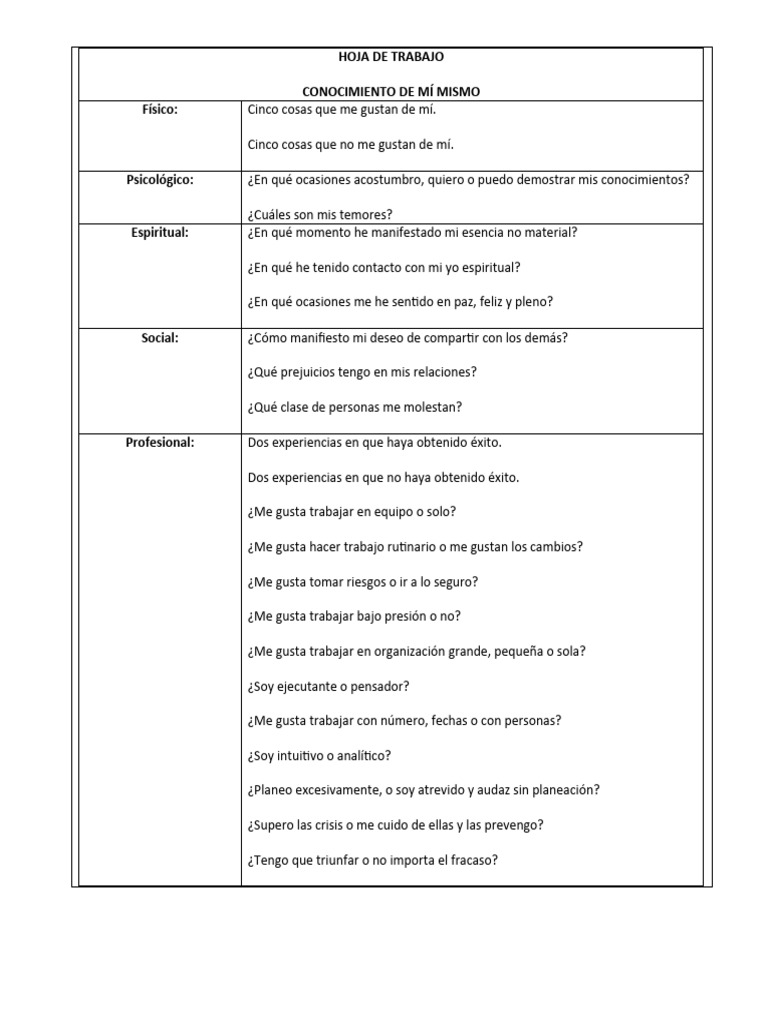 Hoja de Trabajo Conocimiento de Mi Mismo | PDF