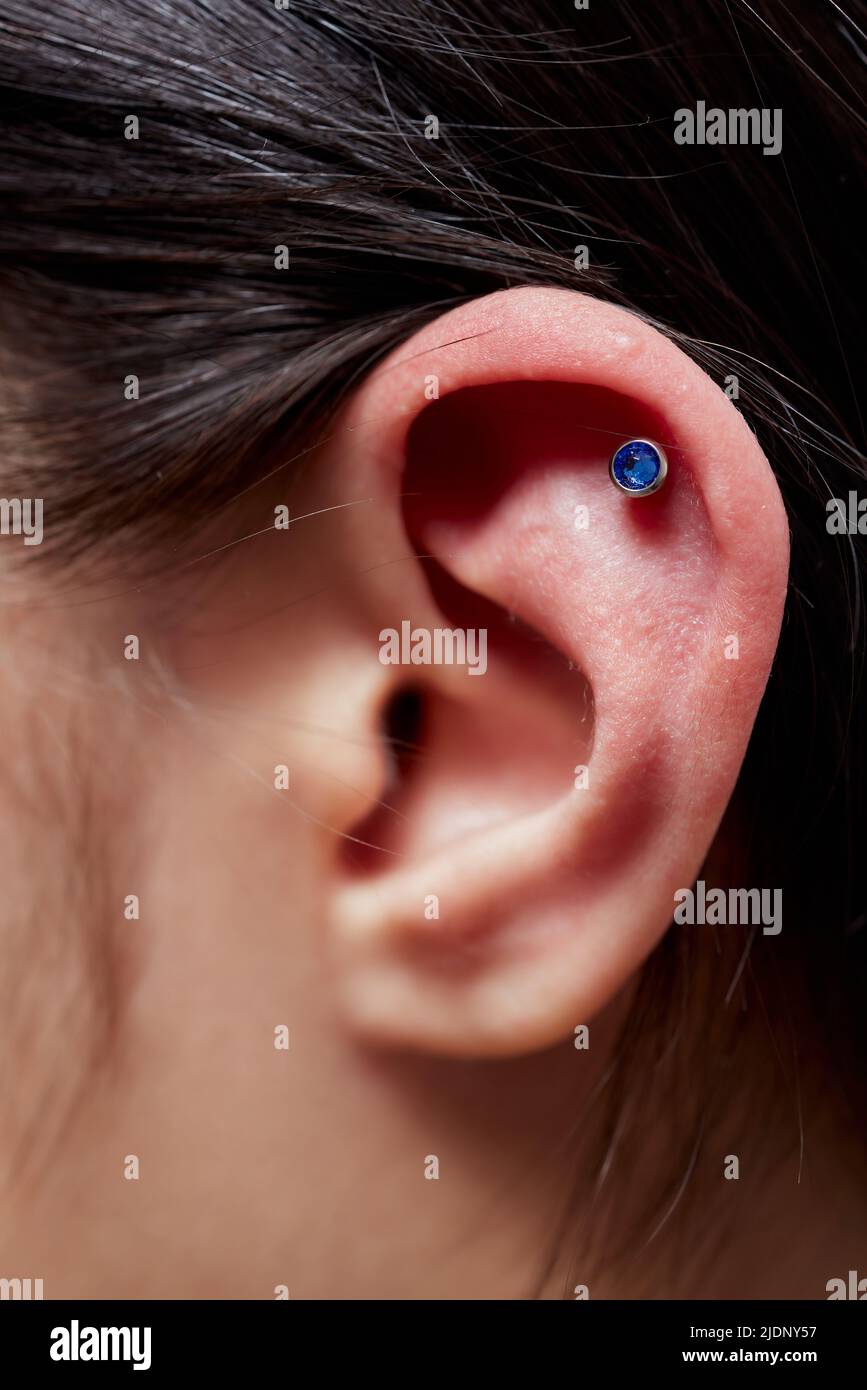 Piercings en una oreja piercings de concha y hélice de cerca ...