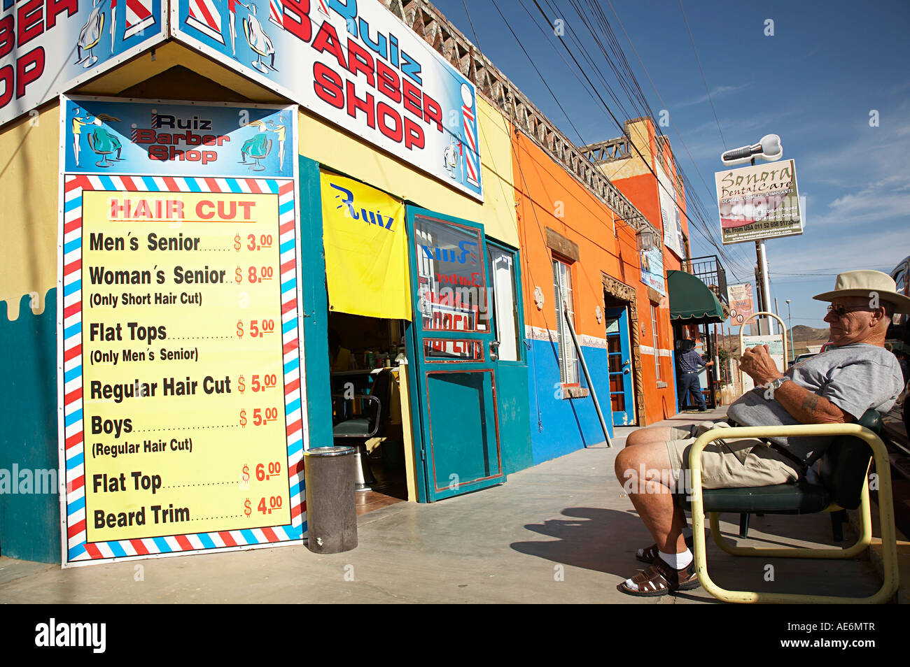 Esperando en la línea turística para un corte de pelo en la barbería local. Los Algodones BC México Fotografía de stock - Alamy