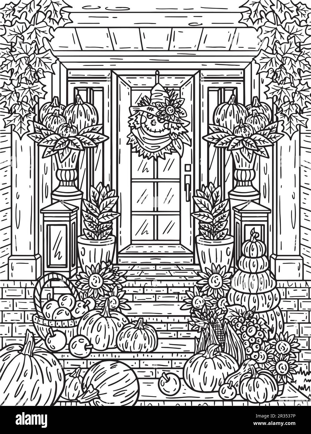 Ilustración de Cosecha De Otoño Para El Día De Acción De Gracias Dibujo Para Colorear Vectorial Para Adultos Corona Blanca Y Negra Hecha Con Hojas Girasol Maíz Manzana Pera Mazorcas De Trigo
