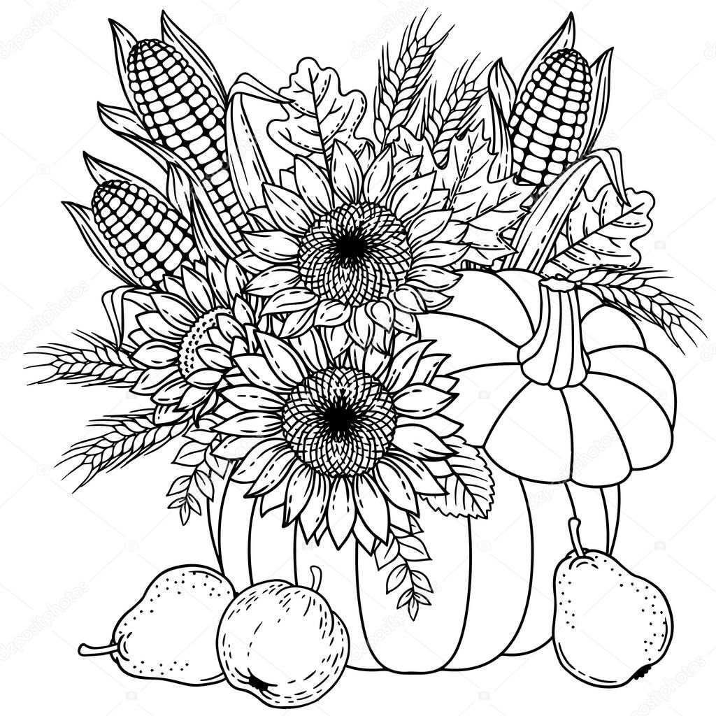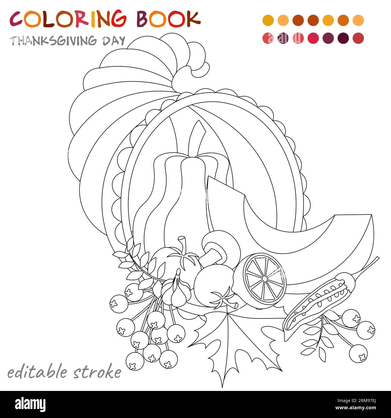 Día de Acción de Gracias. La cornucopia se llena de cosecha. Plantilla para colorear para niños y adultos. Para la relajación y el descanso Imagen Vector de stock - Alamy