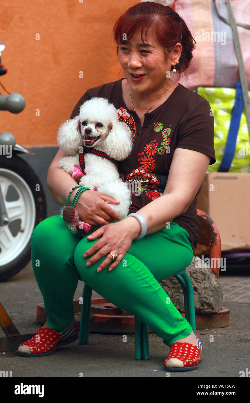 Una mujer sostiene a su perro chino en Beijing el 29 de mayo de 2014. Petco y PetSmart son los últimos a los minoristas dicen que dejarán de vender golosinas para perros
