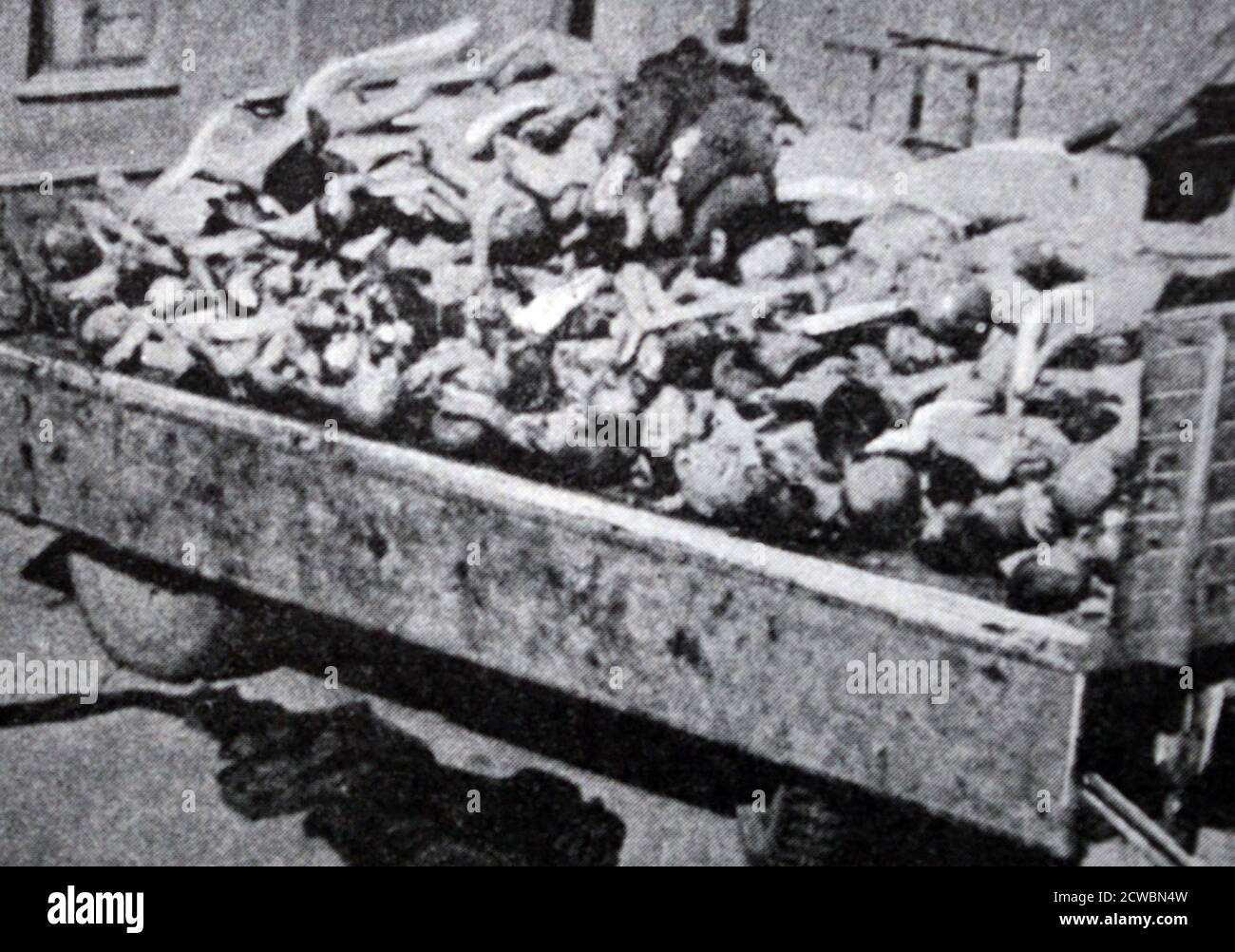 Fotografía en blanco y negro de la Segunda Guerra Mundial (1939-1945) que muestra los campos de concentración alemanes en Buchenwald y Struthof; un camión contiene docenas de cuerpos de personas ejecutadas por