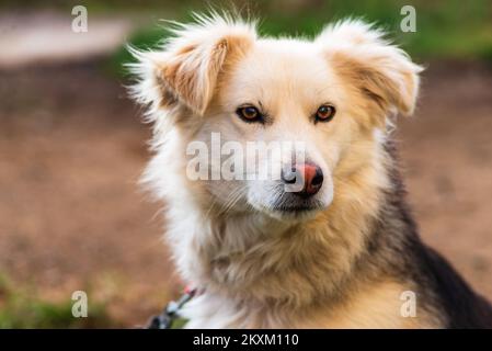 Un perro de raza desconocida se sienta en la hierba. de cerca.. | Foto Premium