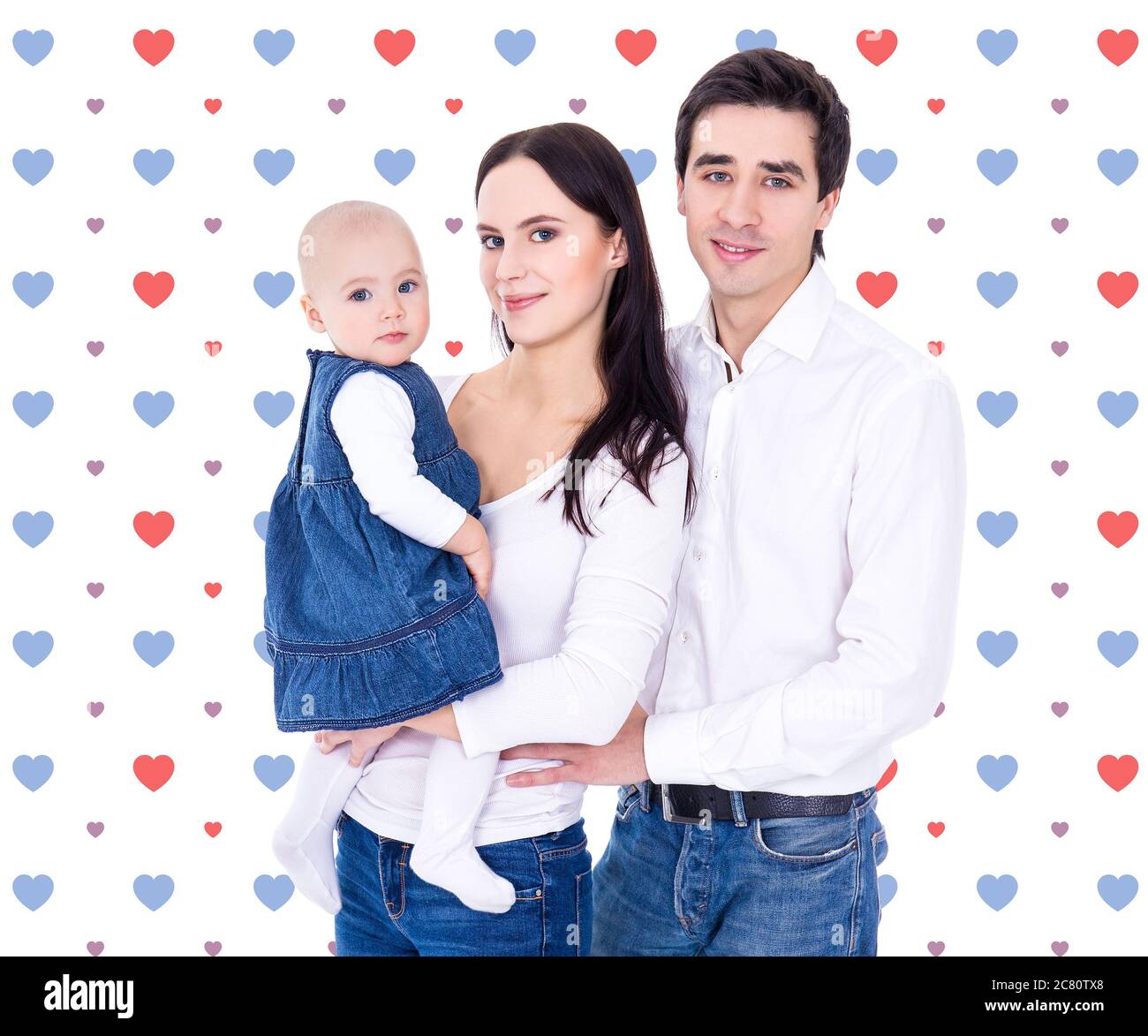 Concepto de amor - feliz familia con hija pequeña sobre textura de fondo con corazones Fotografía de stock - Alamy
