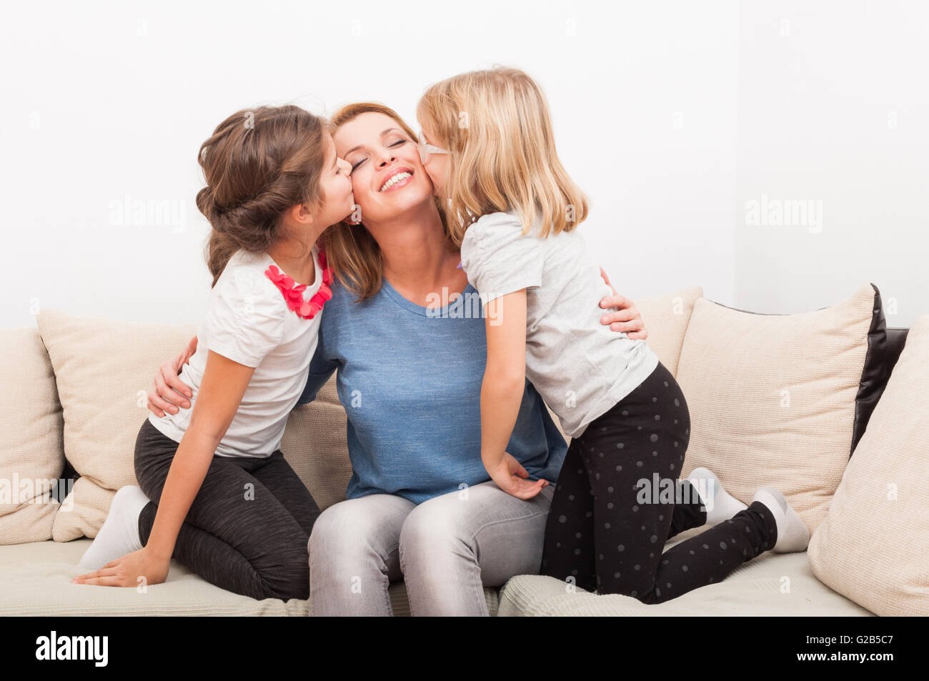 Feliz madre con sus hijas jóvenes besar como concepto de amor familiar en casa en un sofá o sillón Fotografía de stock - Alamy