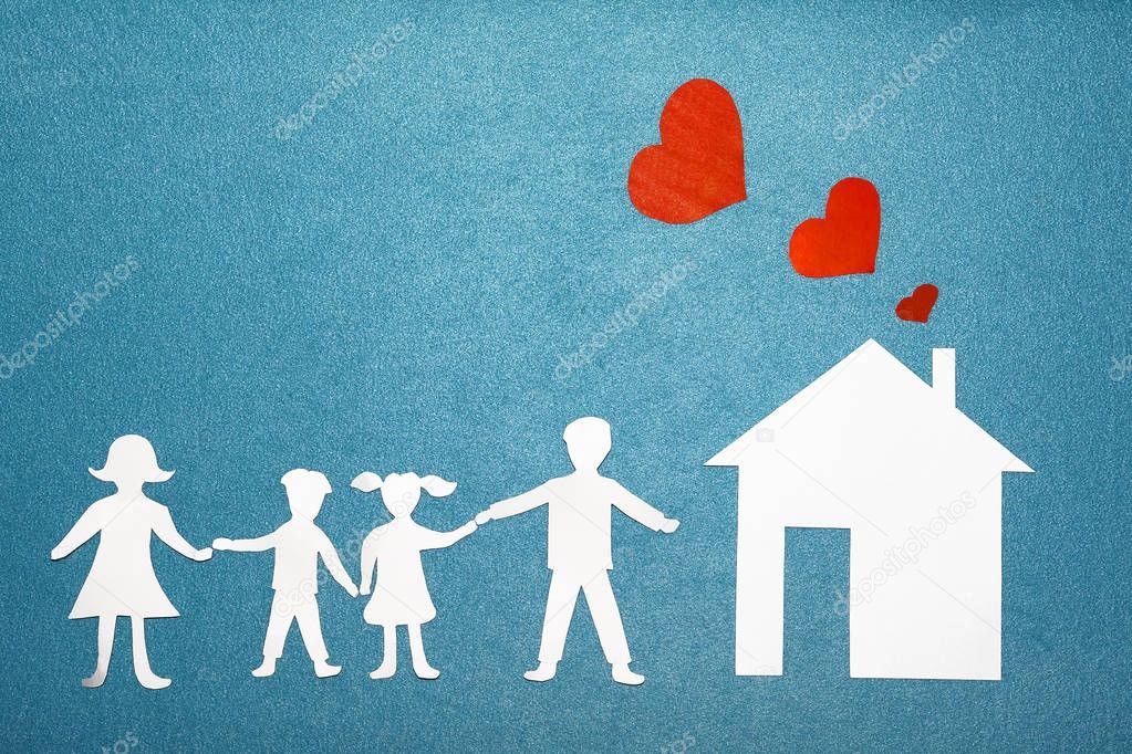 Concepto De Amor Familiar Y El Hogar Casa De Papel Y Familia Sobre Fondo Azul Con Textura Papá Mamá Hija E Hijo Toman De La Mano Corazones Rojos De Pipa En El