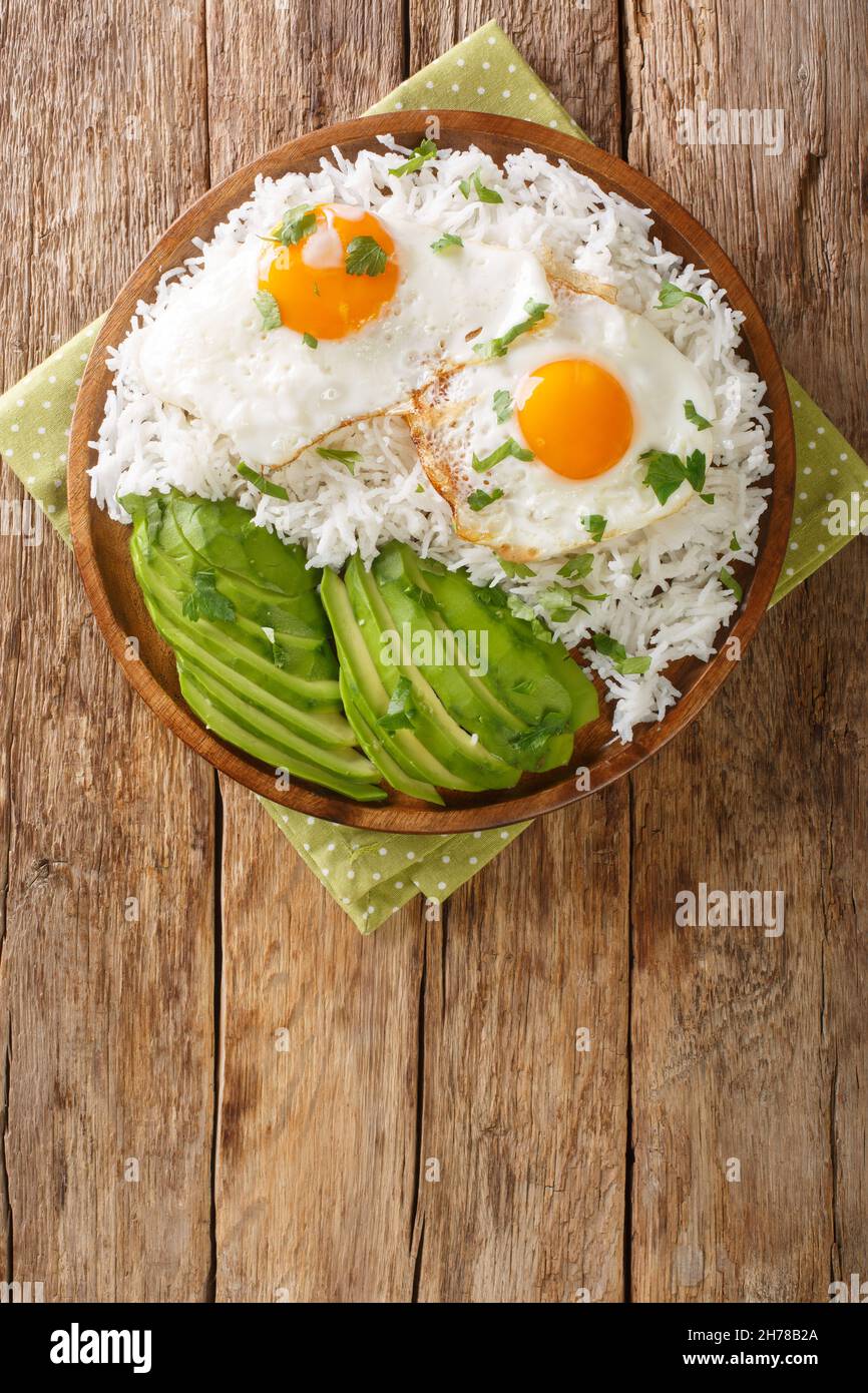 Desayuno ecuatoriano simple de arroz hervido y huevos fritos en un plato en la mesa. Vista vertical de arriba Fotografía de stock - Alamy