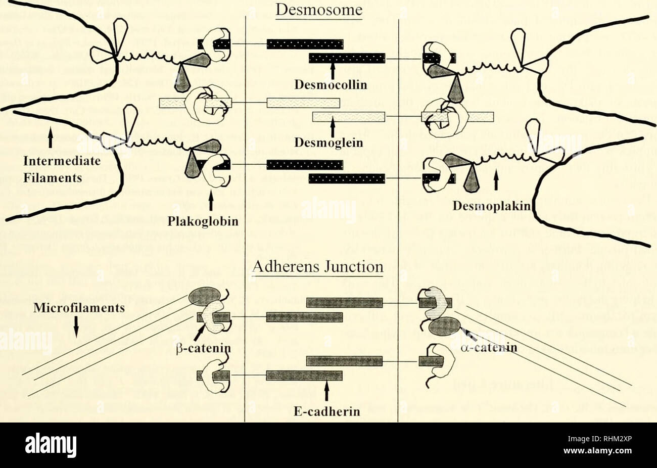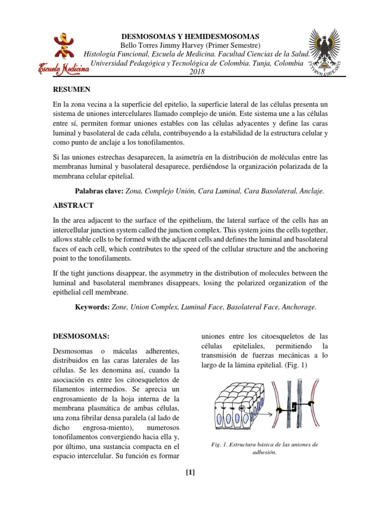 🟣 Los desmosomas uniones intercelulares, que mantienen adheridas una célula con otra. 🟣Esta unión está mediada por cadherinas (desmogleína y desmocolina), a filamentos intermedios a la queratina. 🟣En el interior de las