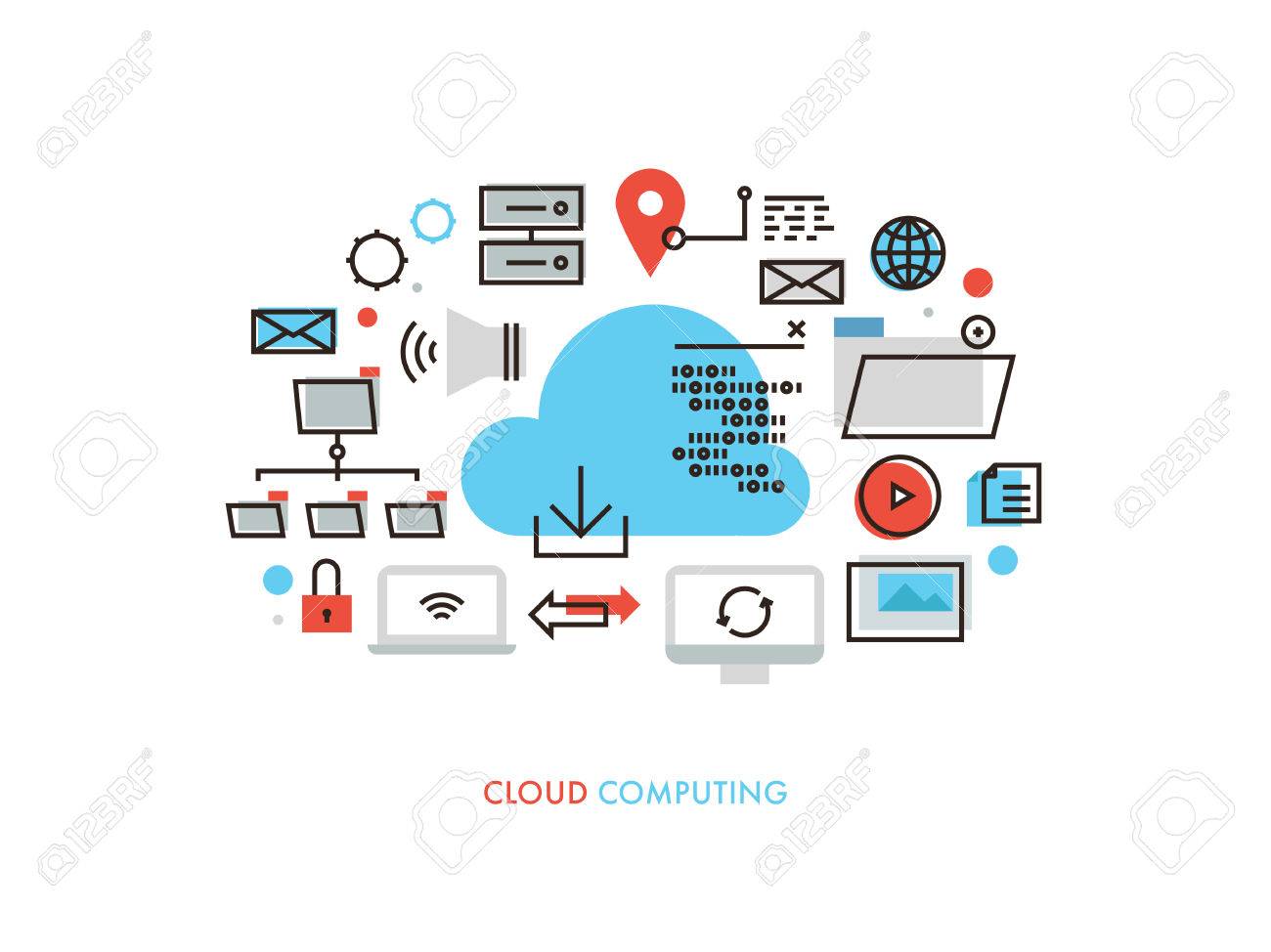 Diseño Plano Delgada Línea De La Arquitectura De Referencia Computación En La Nube, Conexión A Internet Seguridad De La Red En Todo El Mundo Para Multimedia De Negocios Ilustraciones svg, vectoriales, clip