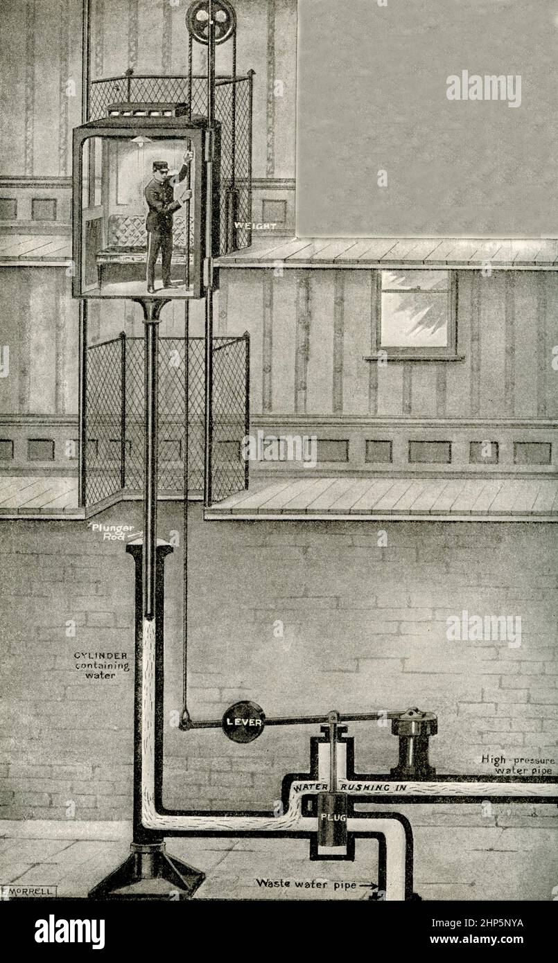 Cómo sube y baja un ascensor. Hay dos tipos de ascensores hoy en día: El hidráulico, que se trabaja con agua, y el eléctrico, que se trabaja con electricidad. La imagen aquí