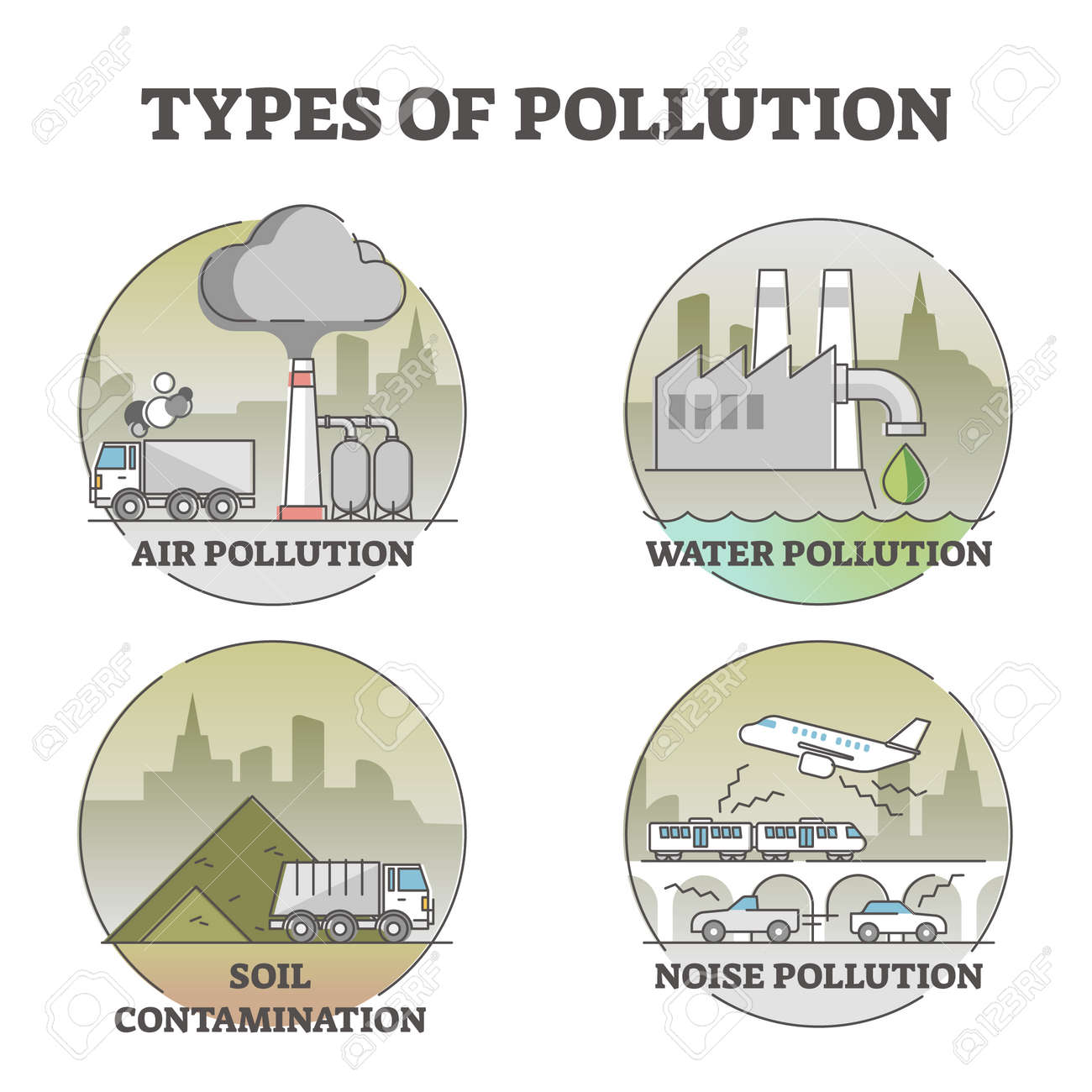 Diagrama De Esquema De Ejemplos De Tipos De Contaminación Con Aire, Agua, Suelo Y Ruido Ilustraciones svg, vectoriales, clip art vectorizado libre de derechos. Image 164962645