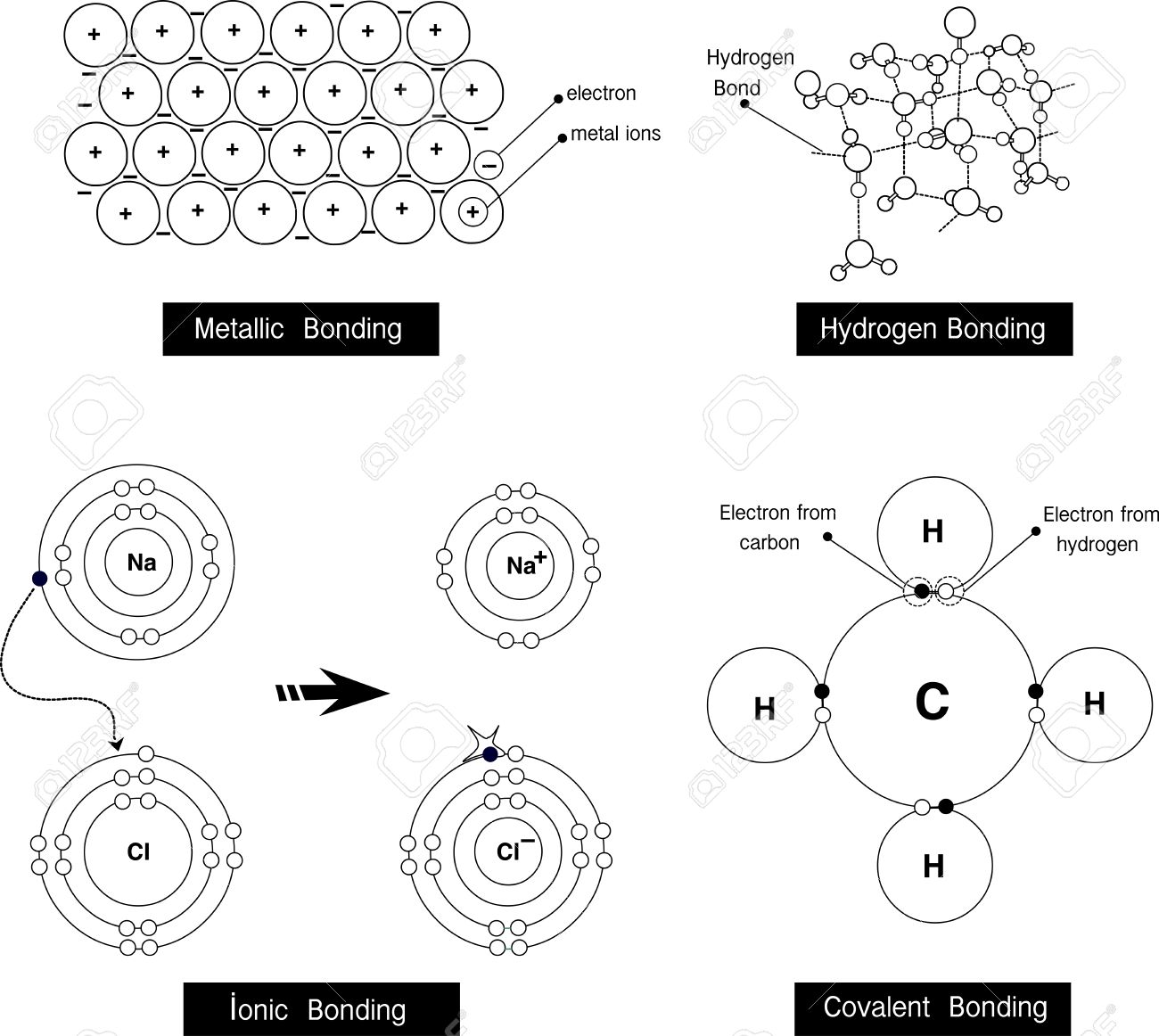 Vector Ilustración De Un Enlace Metálico, Enlace De Hidrógeno, Enlace Iónico, Enlace Covalente Ilustraciones svg, vectoriales, clip art vectorizado libre de derechos. Image 69000152