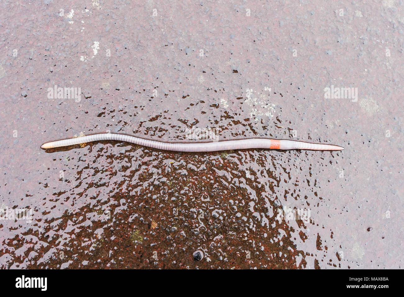 Earthworm Quickly Crawls on Wet Sand in Rays the Sunlight. Lumbricus terrestris, a common European earthworm wriggles, loosens ground. The skin of worm flickers reflects glare of sun. Summertime. 4K.