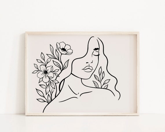 Mujer con flores línea arte impresión, cara femenina colores neutros línea dibujo, cara y flores horizontal imprimible pared arte Boho Decoración - Etsy México