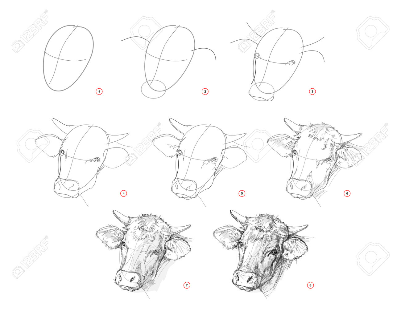 La Página Muestra Cómo Aprender A Dibujar Un Boceto De Una Cabeza De Vaca. Lecciones De Dibujo A Lápiz. Página Educativa Para Artistas. Libro De Texto Para El Desarrollo De Habilidades Artísticas.
