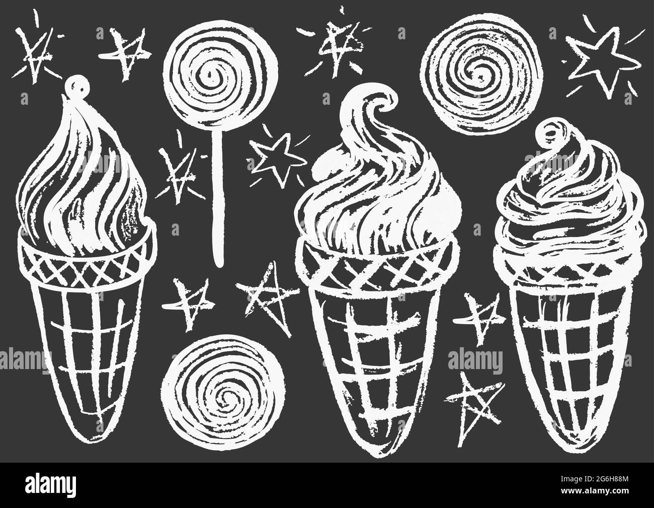 Lindo dibujo infantil con tiza blanca en pizarra. Tiza pastel o lápiz divertido estilo de fideos vector. Juego de dulces fríos de verano. Helado, helados Imagen Vector de stock - Alamy