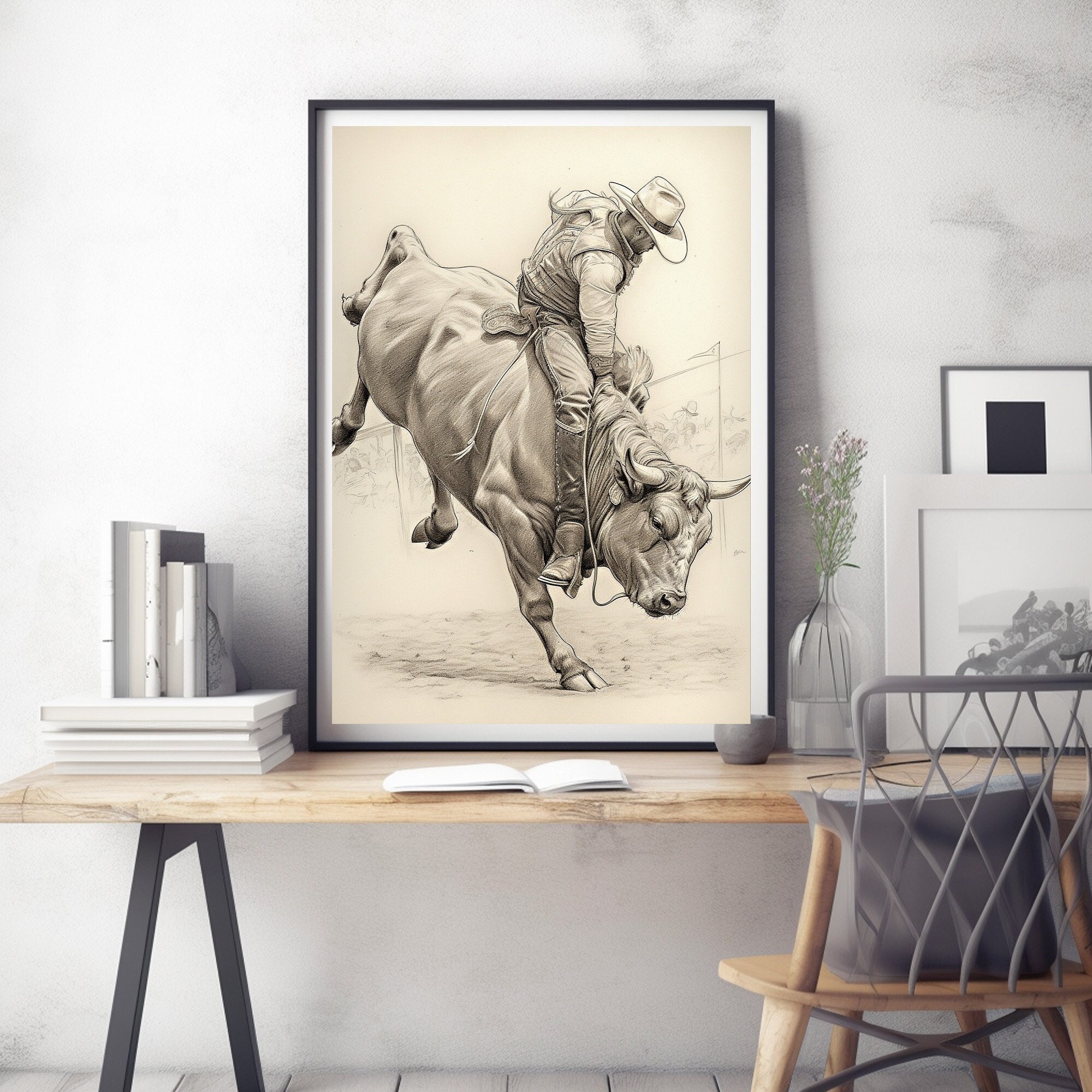 Impresión de VINTAGE Art 1970s Cowboy BULL RIDING Rodeo Evento Cowboy Cowgirl Rustic Western Pencil Drawing - Etsy México