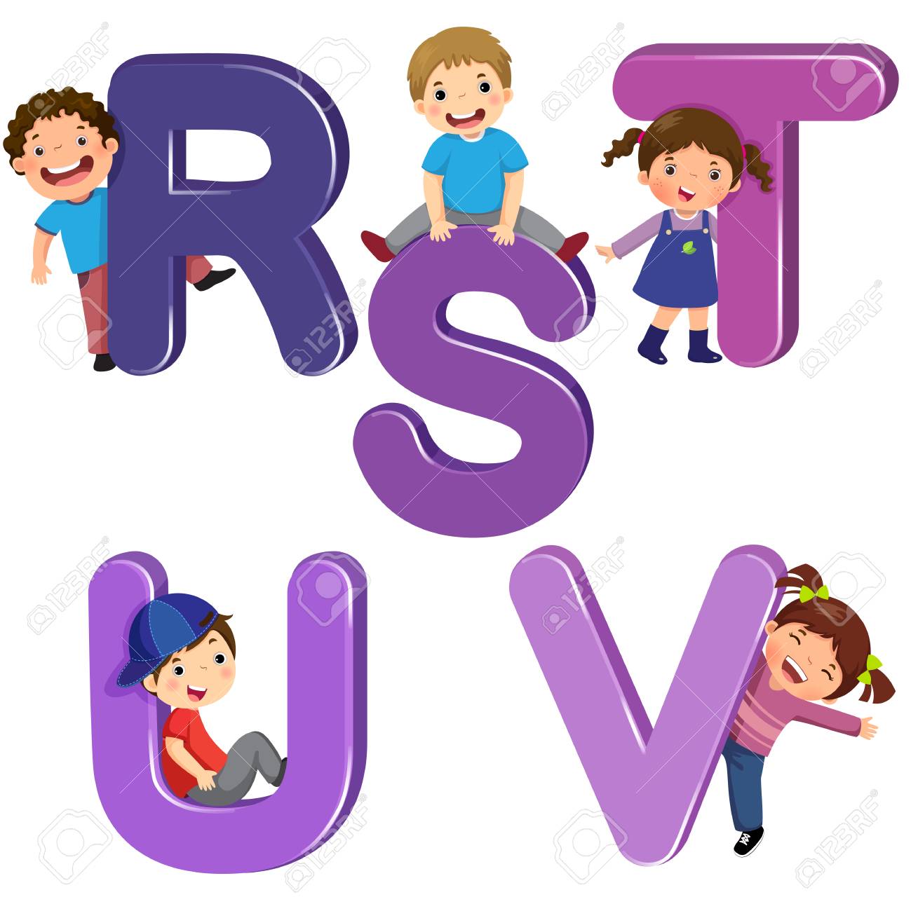 Niños De Dibujos Animados Con Letras RSTUV Ilustraciones svg, vectoriales, clip art vectorizado libre de derechos. Image 91669724