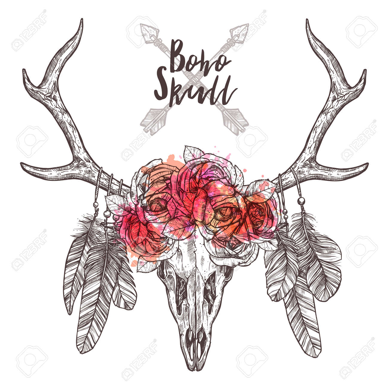 Dibujo De Cráneo De Ciervo Con Flechas Tribales, Plumas Y Rosas De Flores. Ilustración Dibujada A Mano De Estilo Rústico Y Hipster Ilustraciones svg, vectoriales, clip art vectorizado libre de derechos. Image
