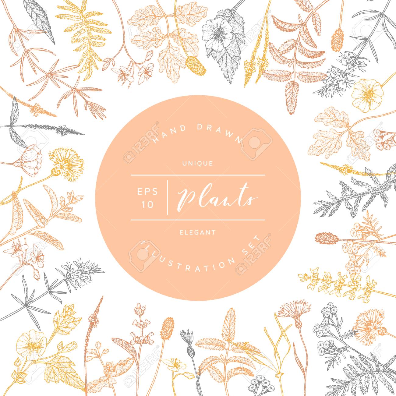 Vector Mano Dibujada Marco Floral O Banner. Elegante Mano Bosquejó Dibujo De Flores. Plantilla De Hierba Hipster Vintage Para Diseño De Envases Cosméticos Naturales Orgánicos. Ilustraciones svg, vectoriales, clip art vectorizado libre