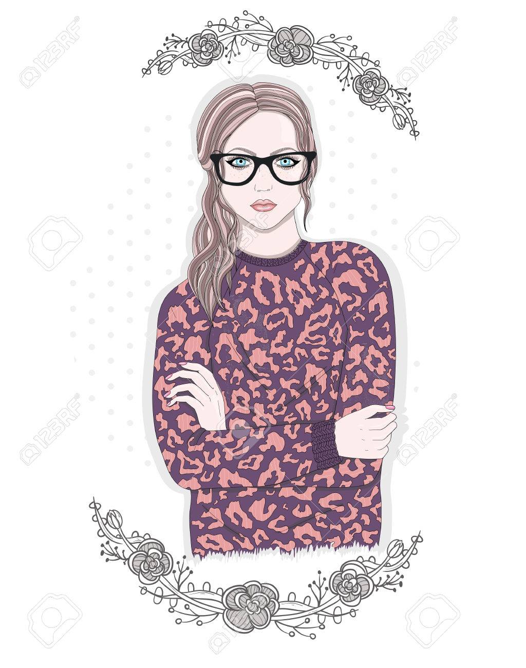 Ilustración Joven Chica De Moda. Chica Hipster Con Gafas Y Flores. Ilustraciones svg, vectoriales, clip art vectorizado libre de derechos. Image 50134904