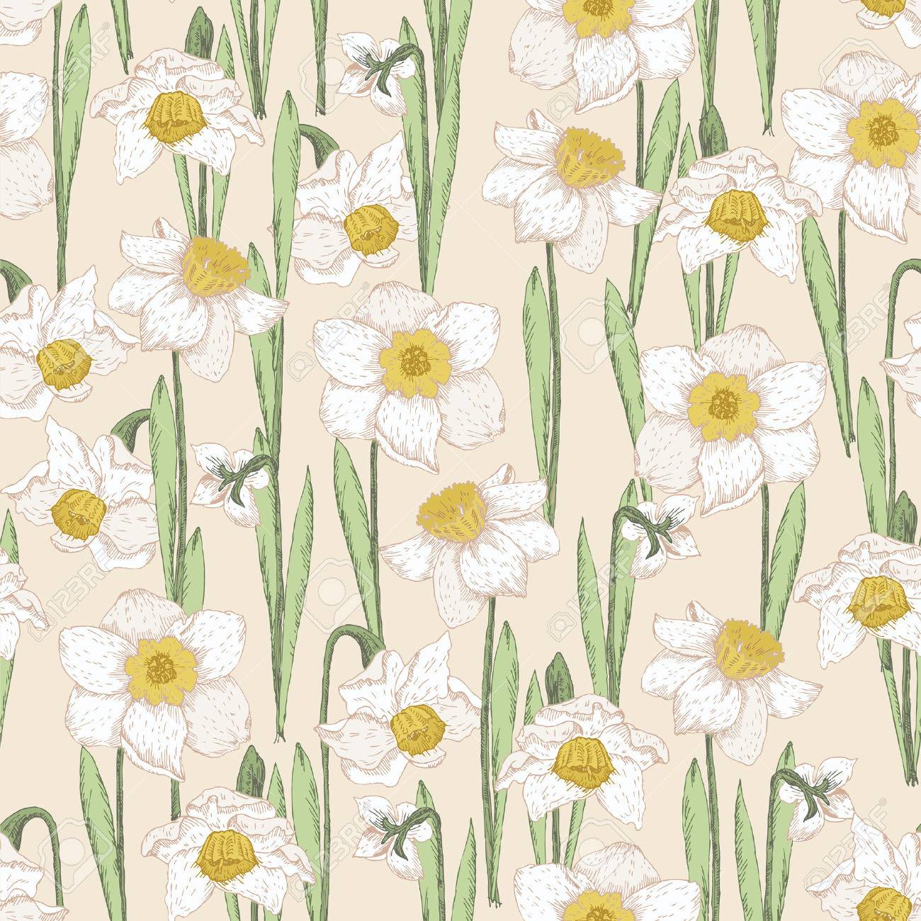 Patrón Sin Fisuras Con Flores De Primavera. Narciso. Verano De Fondo Floral. Textura Con Las Plantas Con Flores En El Estilo De Dibujo De La Vendimia. Sketch. Diseño Flor Hipster. Ilustraciones svg,