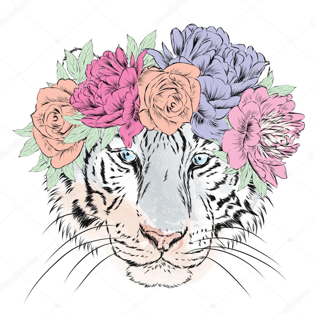 Vector tiger in a wreath of flowers. Hipster. Vector illustration for greeting card, poster, or print on clothes. Stock Vector by ©VitalyGrin 118689208