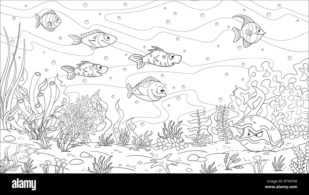Mundo Submarino De Dibujos Animados Con Corales Y Anémonas Sobre Arenisca Rodeados De Peces Delineados Para Colorear Stock de ilustración - Ilustración de flora, contorneado: 235285794