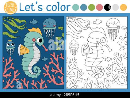 Debajo del dibujo para colorear del mar para los niños con la escena submarina del caballito de mar. Vector océano vida esquema ilustración. Libro de color para niños con examen de color