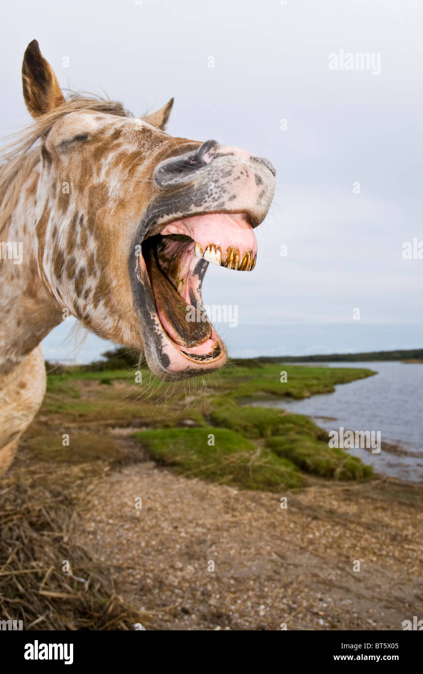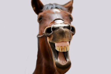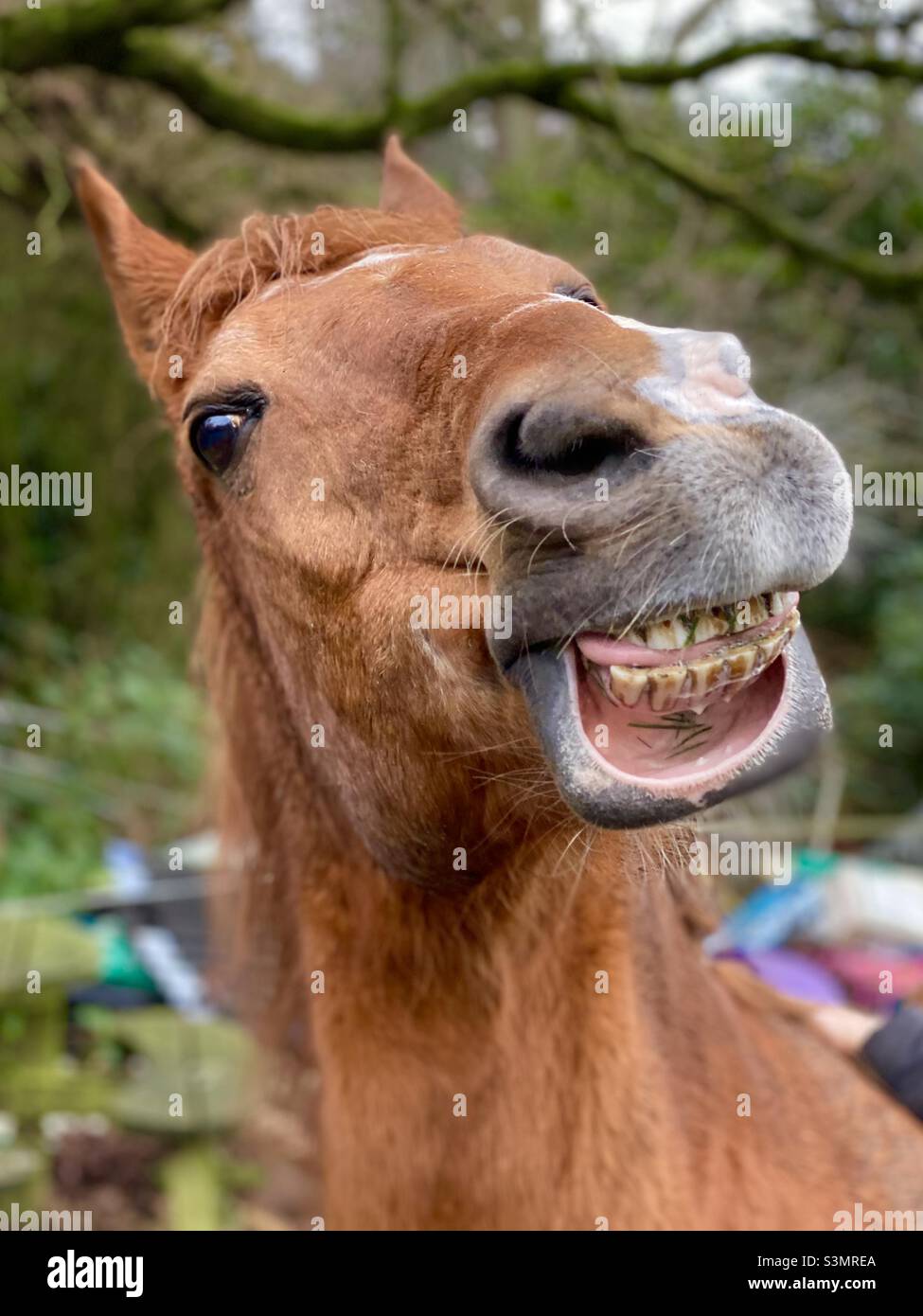 Sonrisa de cara de caballo. Cabeza de caballo gracioso closeup de joven semental sonriendo y riendo con dientes grandes Fotografía de stock - Alamy