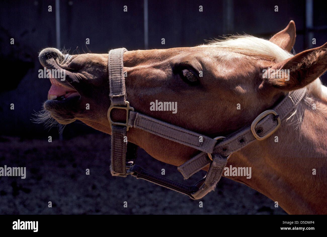 Un caballo palomino echa para atrás sus labios para mostrar sus encías y dientes en una sonrisa feliz en California, Estados Unidos Fotografía de stock - Alamy