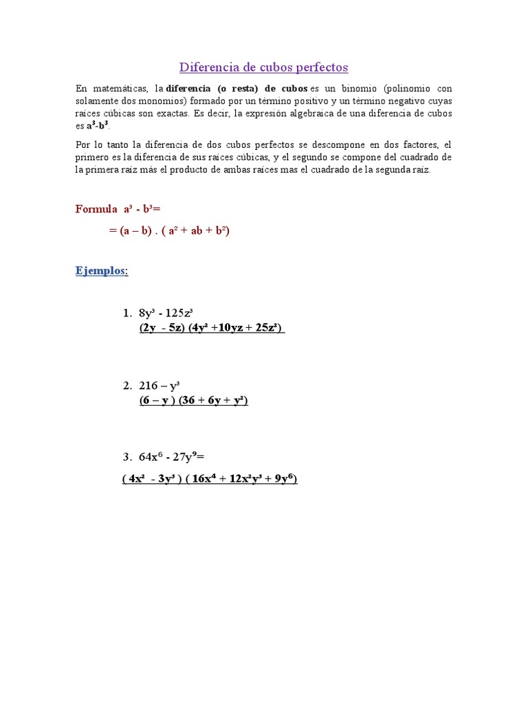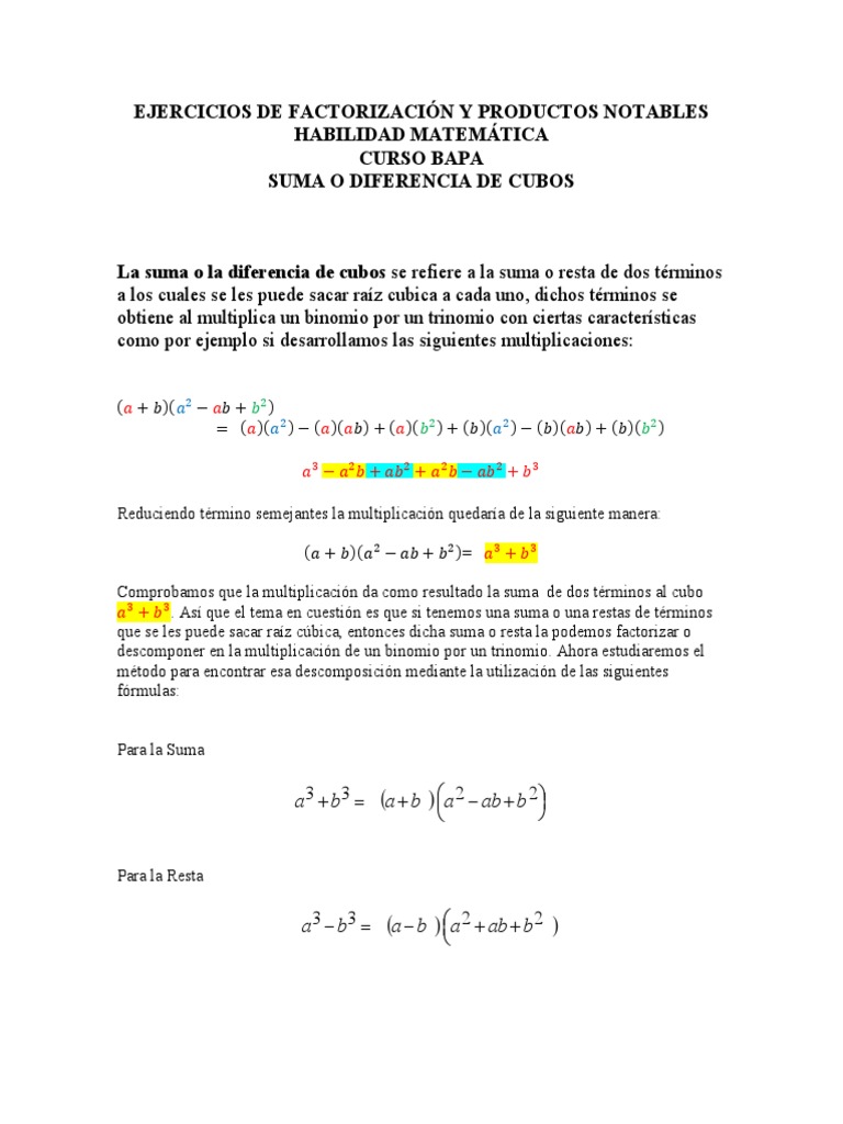 SUMA Y DIFERENCIA DE CUBOS EJEMPLOS Y EJERCICIOS RESUELTOS DE PRODUCTOS NOTABLES PDF | Ejercicios resueltos, Productos notables, Matematica ejercicios