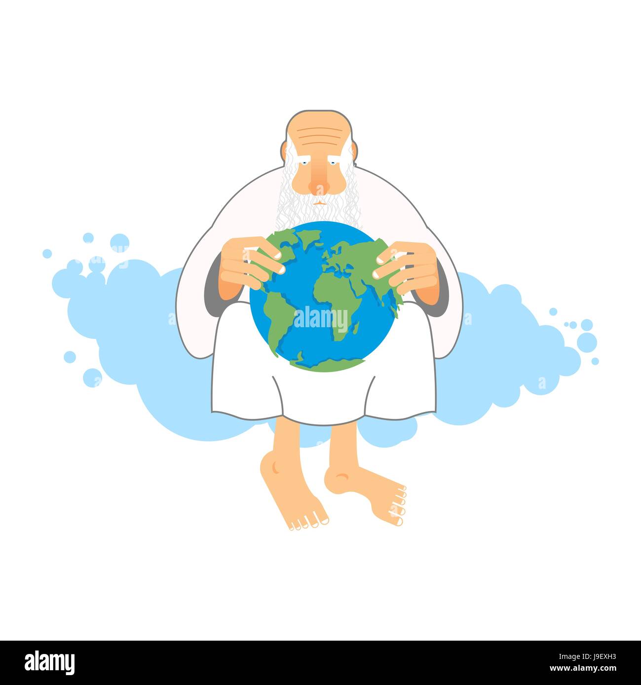 Dios Ve La Tierra En Sus Manos. Creador Mantiene El Universo. Abuelo Viejo Con La Barba Y Ropa Blanca Crea La Paz. Dios Creó Al Mundo Ilustraciones svg, vectoriales, clip art vectorizado