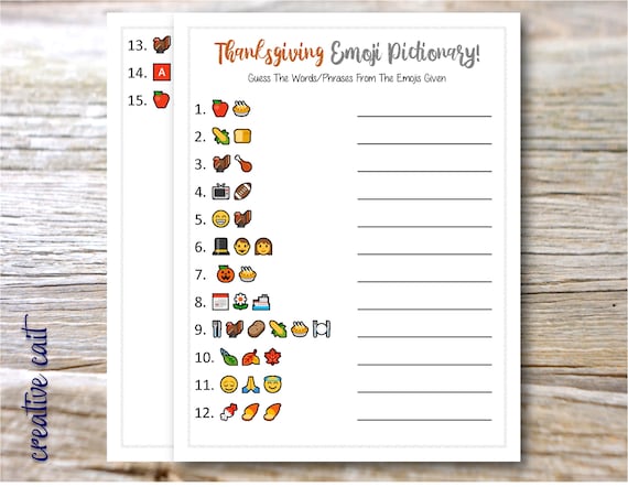 Juego Pictionary de emojis, juego de palabras de Acción de Gracias, juego imprimible, juego familiar divertido, juego de películas imprimible, ...