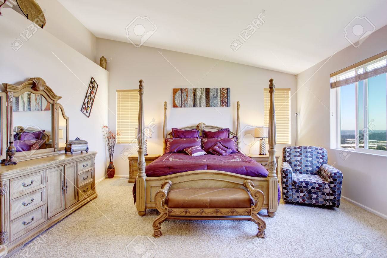 Dormitorio De Lujo Con Alto Poste Cama De Madera Tallada, Ropa De Cama De Color Púrpura Brillante Y Gabinete De La Vanidad Fotos, retratos, imágenes y fotografía de archivo libres de derecho.