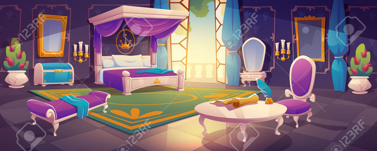Interior De Dormitorio Real, Habitación De Lujo King O Queen En Palacio Con Muebles Morados De Estilo Imperio Clásico. Cama Con Dosel, Mesa Con Documentos Y Cofre, Ilustración Vectorial De Dibujos Animados