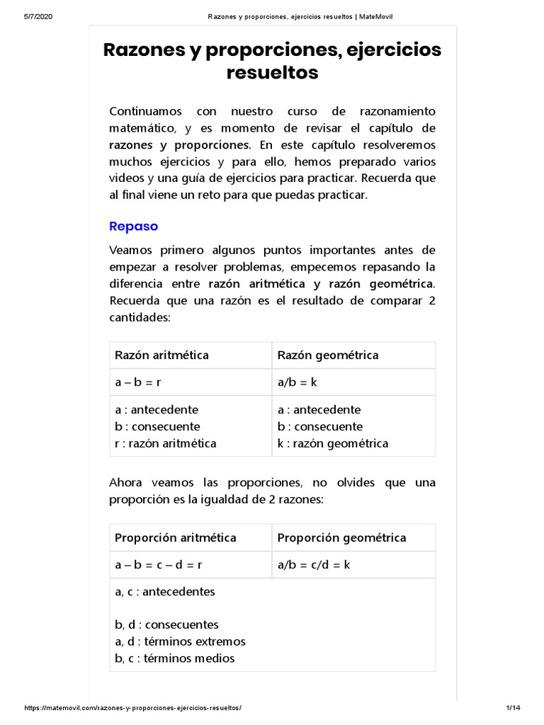 Razones y Proporciones, Ejercicios Resueltos - MateMovil | PDF | Proporción | Enseñanza de matemática
