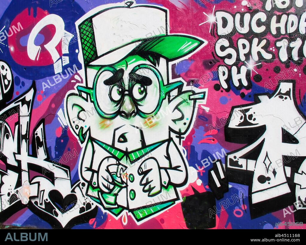 Ilustracion estilo comic de señor con gafas y gorra con fondo colorido; graffiti mural, plaza de las glorias; distrito San Martin, Barcelona, en 2014. - Album alb4511168