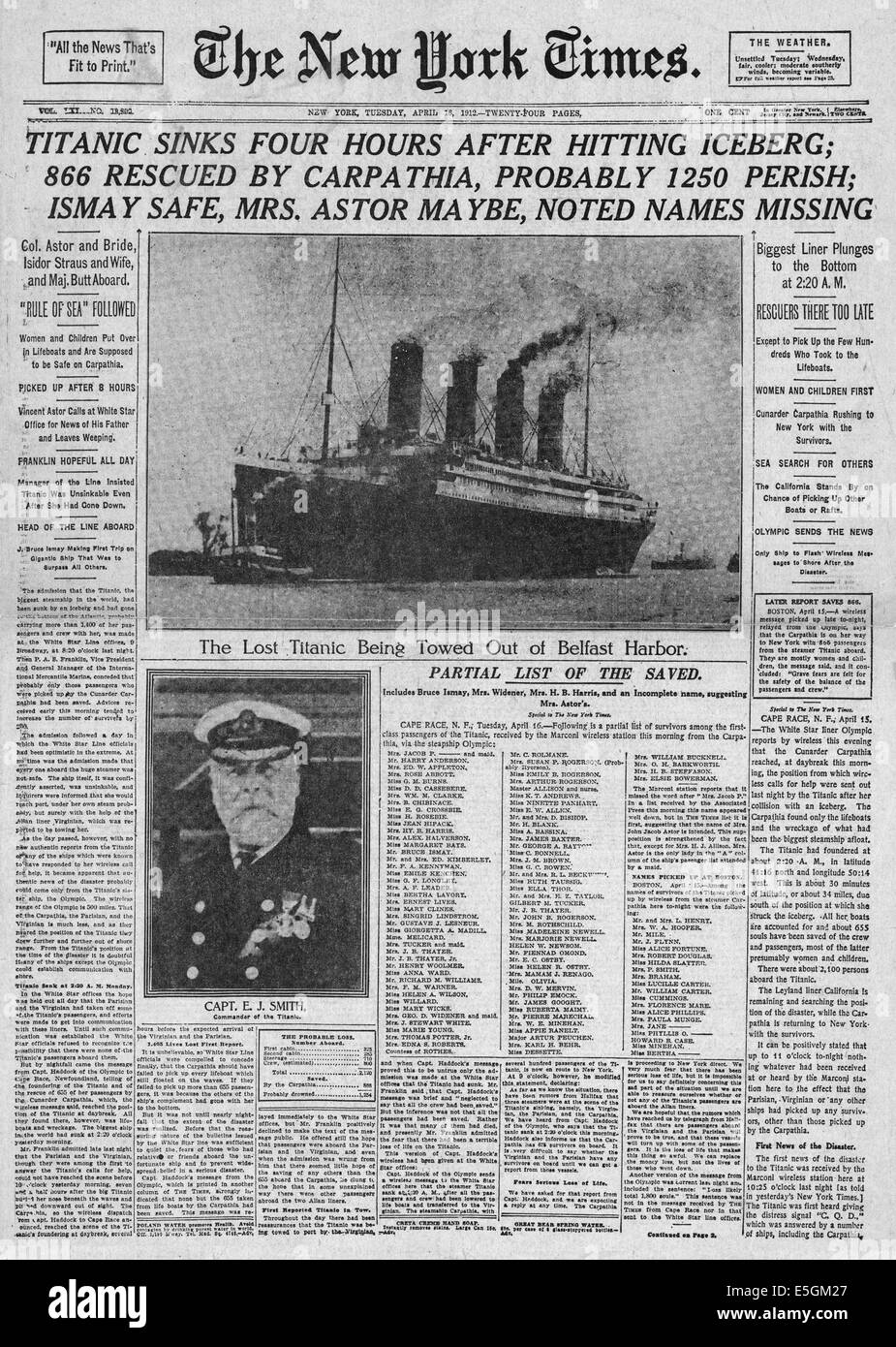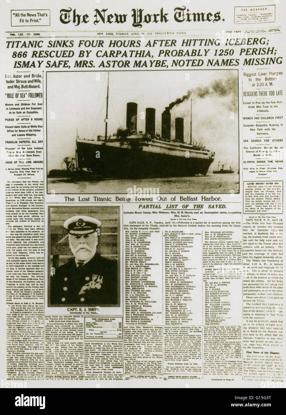 1912 portada noticias del New York Times sobre el hundimiento del Titanic después de chocar con el iceberg Fotografía de stock - Alamy