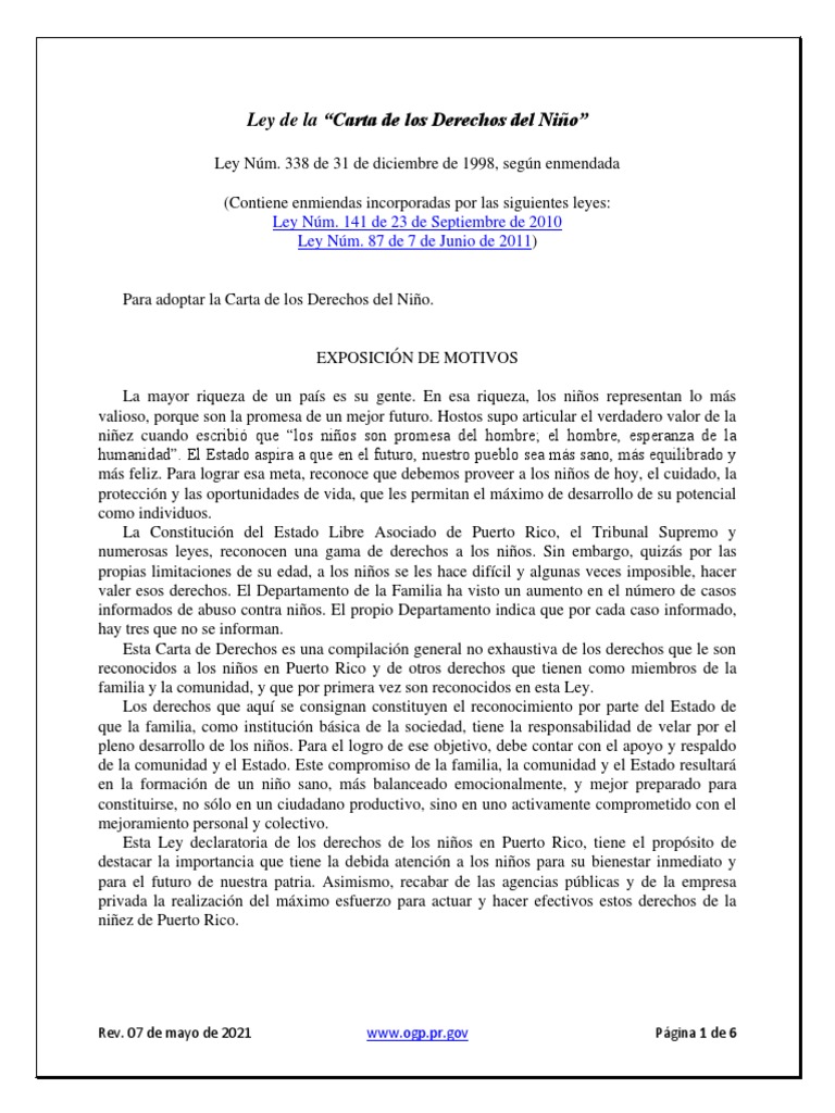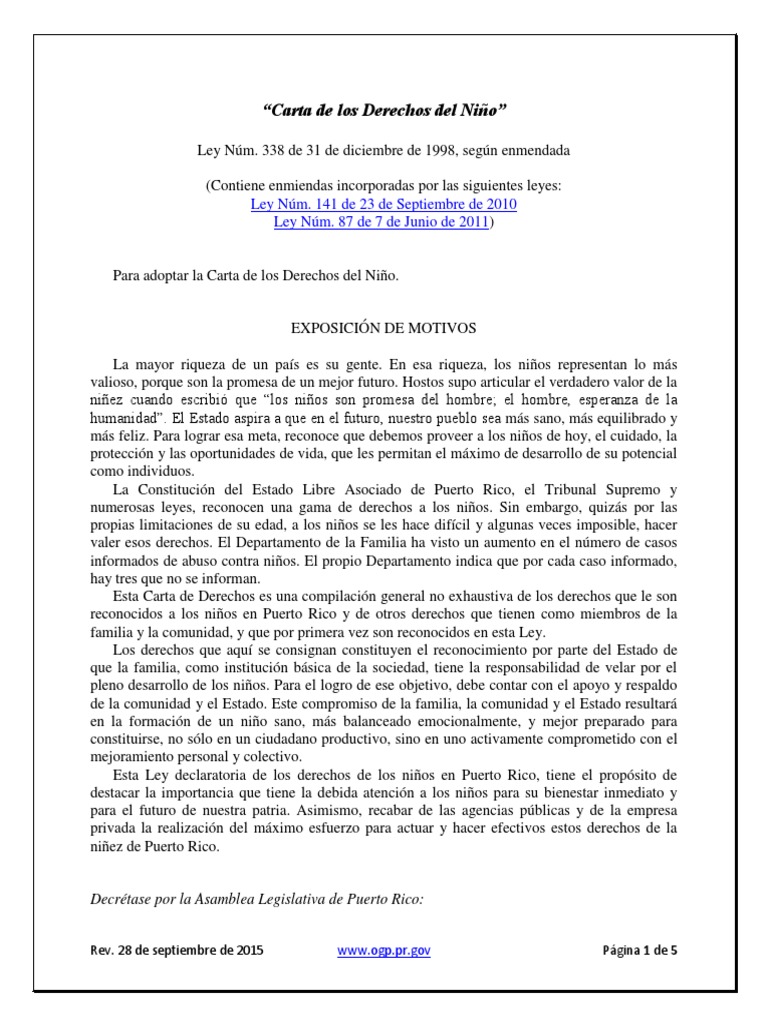 338-1998 Carta de Derechos Niño de Puerto Rico Con Enmiendas | PDF | Abuso infantil | Puerto Rico