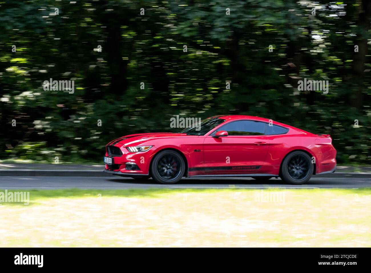 Foto de LA, California - April 30, 2023 Ford mustang red car driving on highway. American muscle car at sunset. rear view do Stock | Adobe Stock