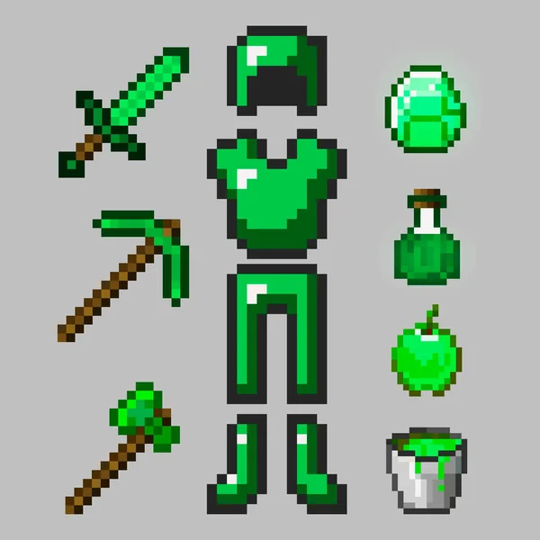 Gran conjunto de armadura de píxeles esmeralda aislada sobre fondo gris. Armadura verde esmeralda, espada, pico, hacha, piedra, manzana, poción. El estilo de 8 bits se dibuja en un estilo plano. Pixel