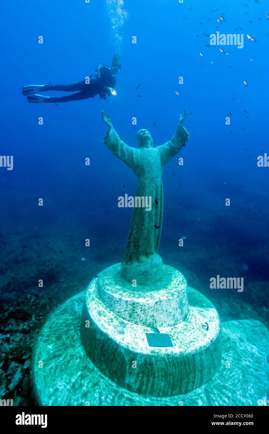 Buceador en Cristo estatua bajo el agua, Mar Mediterráneo, bahía de San Fruttuoso, Portofino, Liguria, Italia Fotografía de stock - Alamy